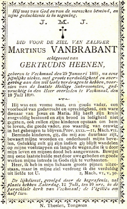 Joannes VANBRABANT (Martinus) | - né le 10-10-1850 à Fimal, (Vechmaal), Heers, Tongres, prov. Limbourg - † le 23-02-1929 à Fimal, (Vechmaal), Heers, Tongres, prov. Limbourg - Age : 78 ans - Cultivateur ... Mariage le 24-11-1880 à Fimal, (Vechmaal), Heers, Tongres, prov. Limbourg avec